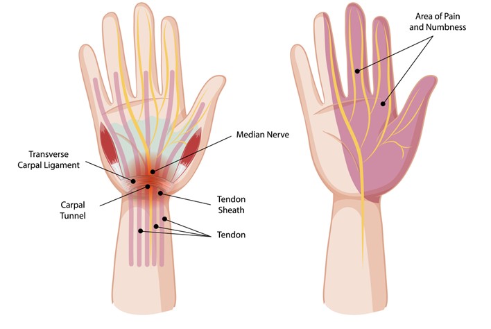 • Repetitive Motion: Frequent and prolonged activities involving the hand and wrist, such as typing or manual labour, can strain the tendons and cause swelling in the carpal tunnel.